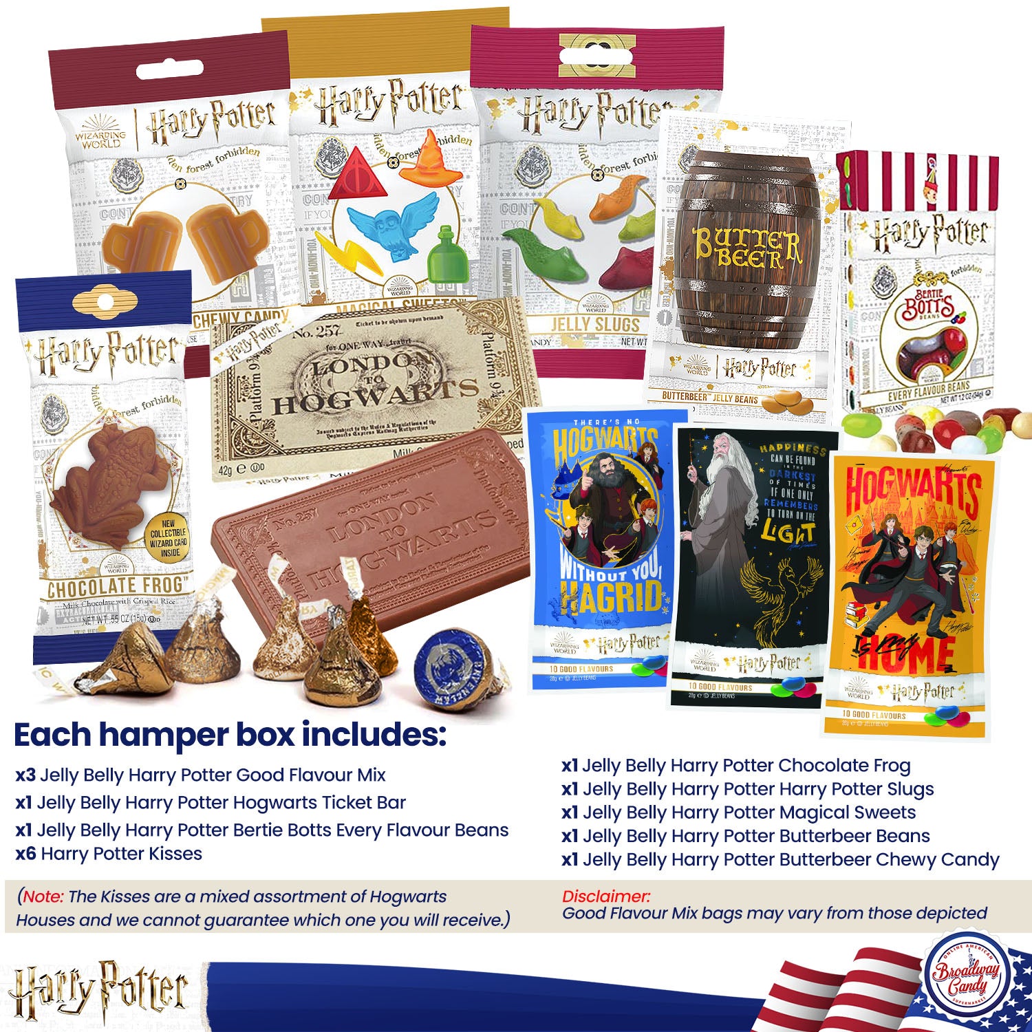• Fan Favourites – Each hamper box includes: 1x Jelly Slugs Bag, 1x Bertie Botts Every Flavour Bean Box, 1x Butterbeer Beans, 1x Magical Sweets Bag, 1x Butterbeer Chewy Bag, 1x Ticket Chocolate Bar, 1x Chocolate Frog, 3x Good Flavour Mix Bags, and 6x Harry Potter- themed Hershey's Kisses!