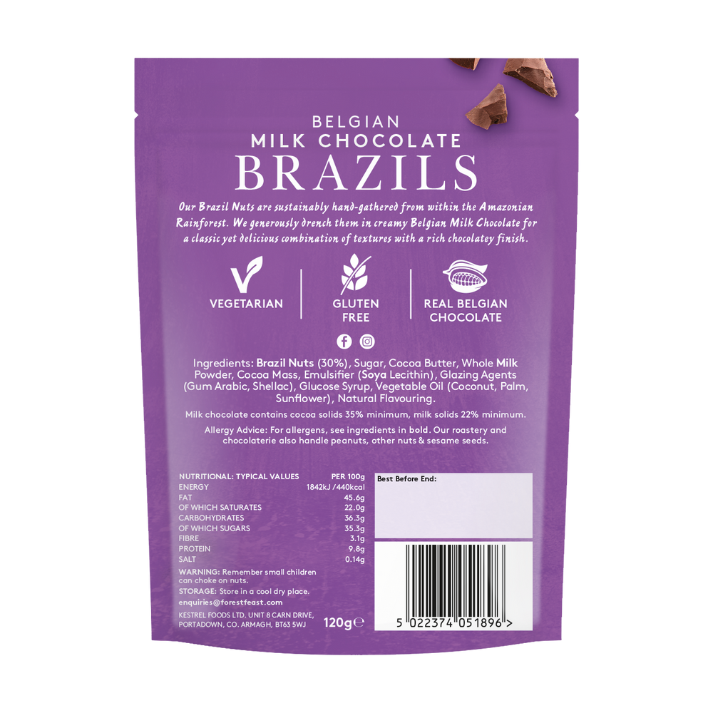 Our Brazil Nuts are sustainably hand-gathered from within the Amazonian Rainforest. We generously drench them in creamy Belgian milk chocolate for a classic yet delicious combination of textures with a rich chocolatey finish.