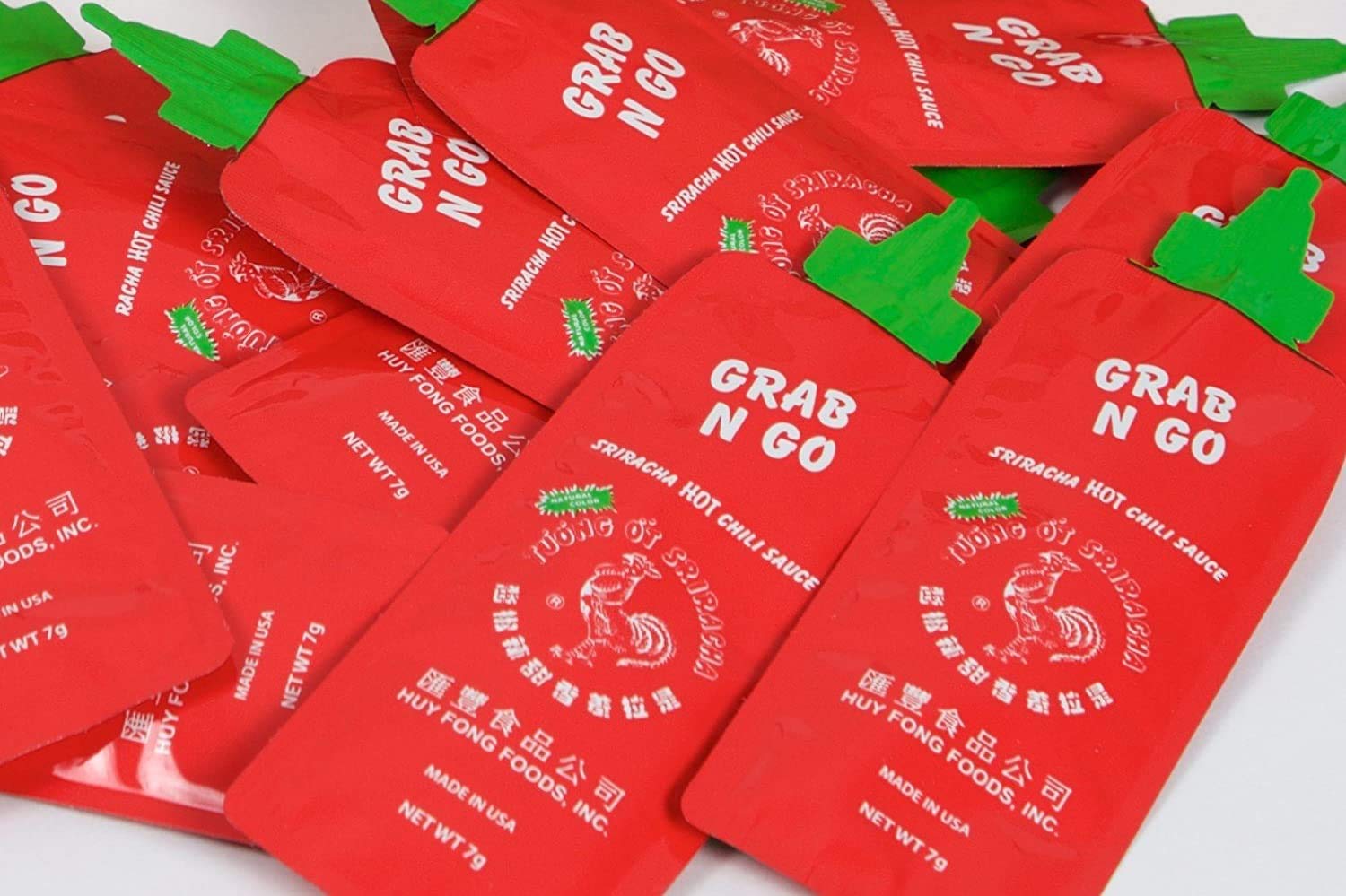 'Grab N Go' bottle-shaped packets filled with Original Huy Fong Sriracha HOT Chili Sauce - one of the world's favourite sauces/condiments!