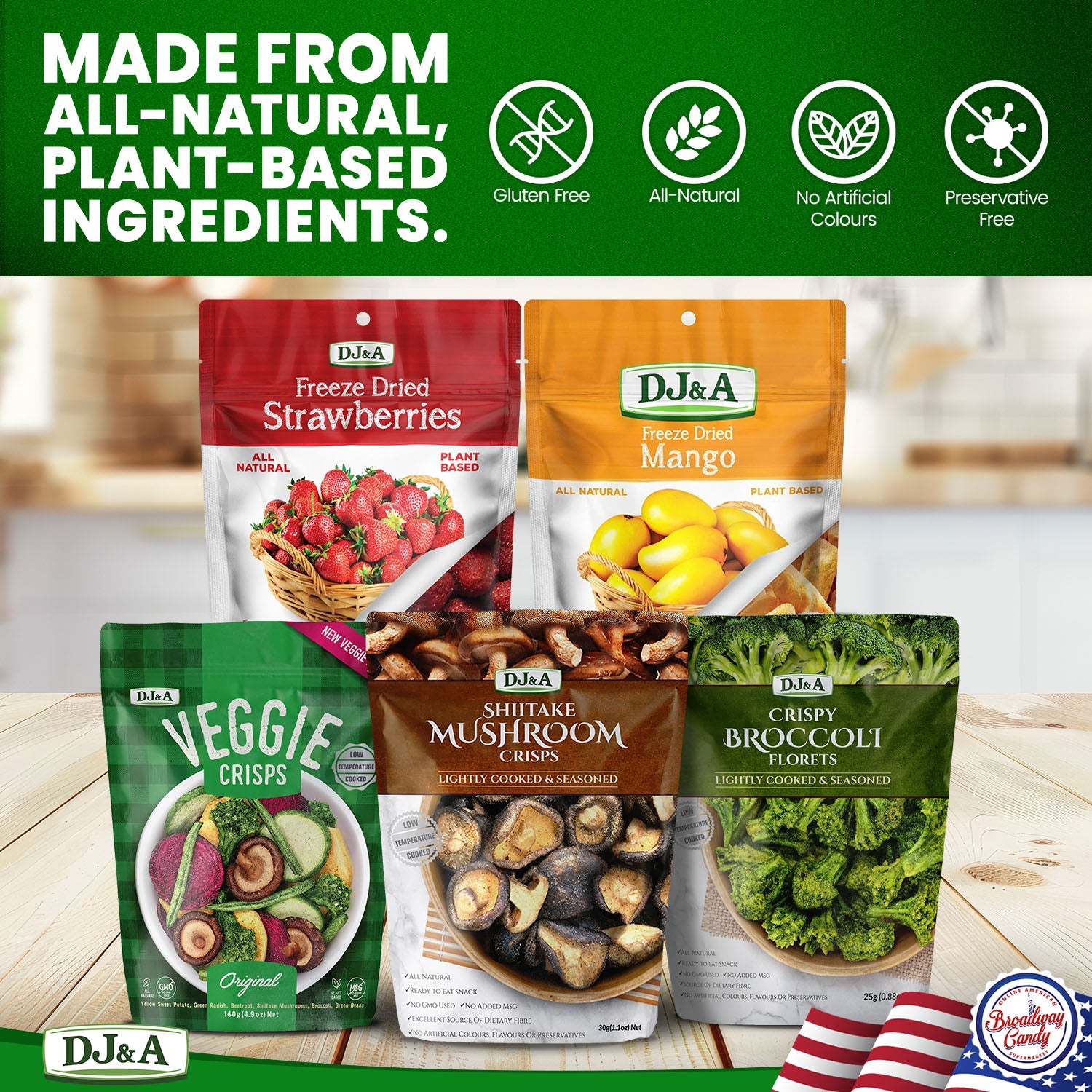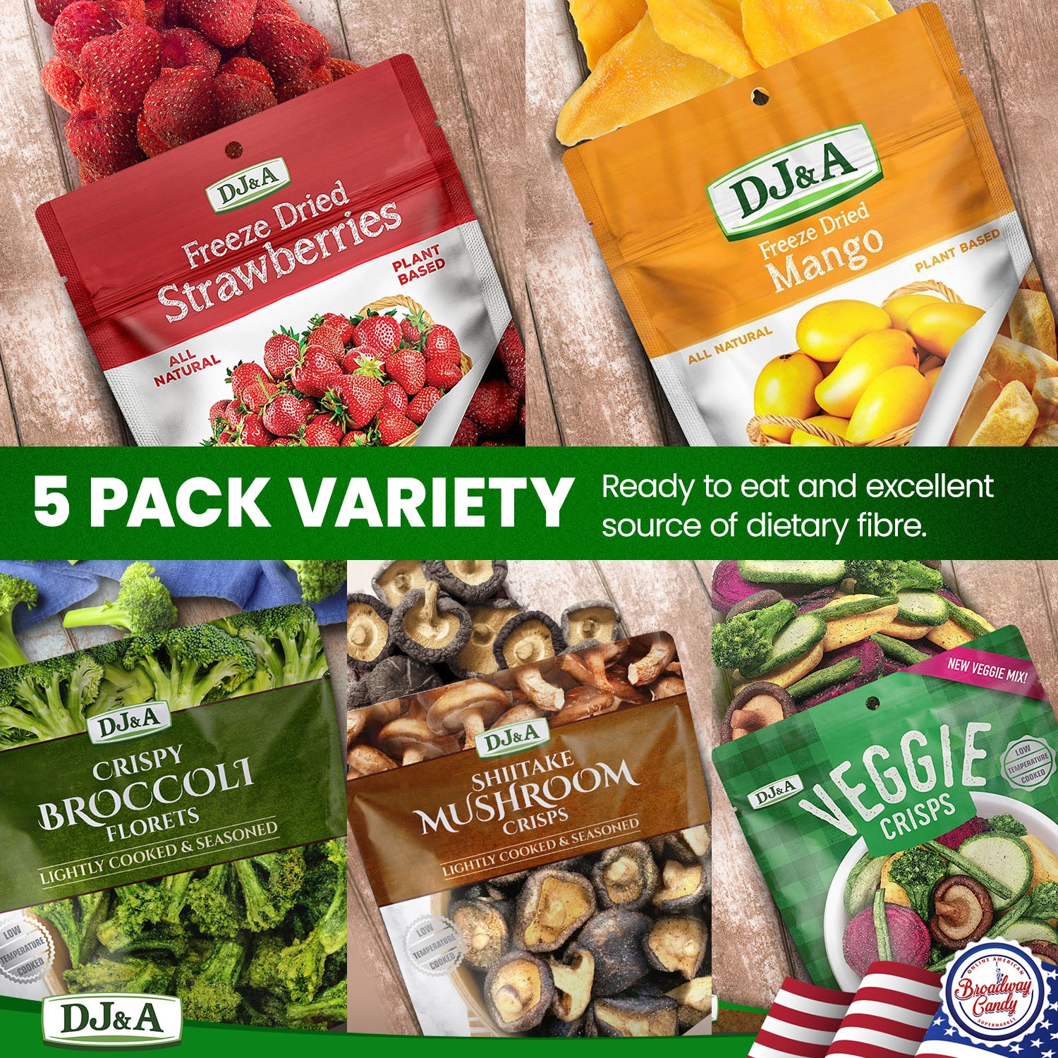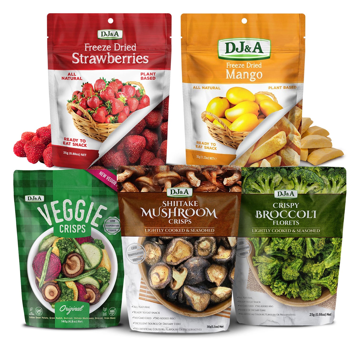 BEST SELLING VARIETY - Enjoy a range of our most popular DJ & A freeze-dried fruit and vegetable crisps. You will receive: 1x DJ & A Veggie Crisps Original 90g, 1x DJ & A Broccoli Florets 25g, 1x DJ & A Shiitake Mushroom Crisps 30g, 1x DJ & A Freeze Dried Mango 35g, and 1x DJ & A Freeze Dried Strawberries 25g