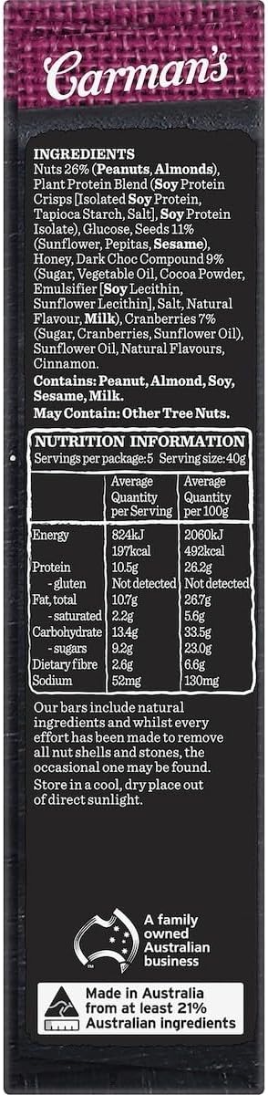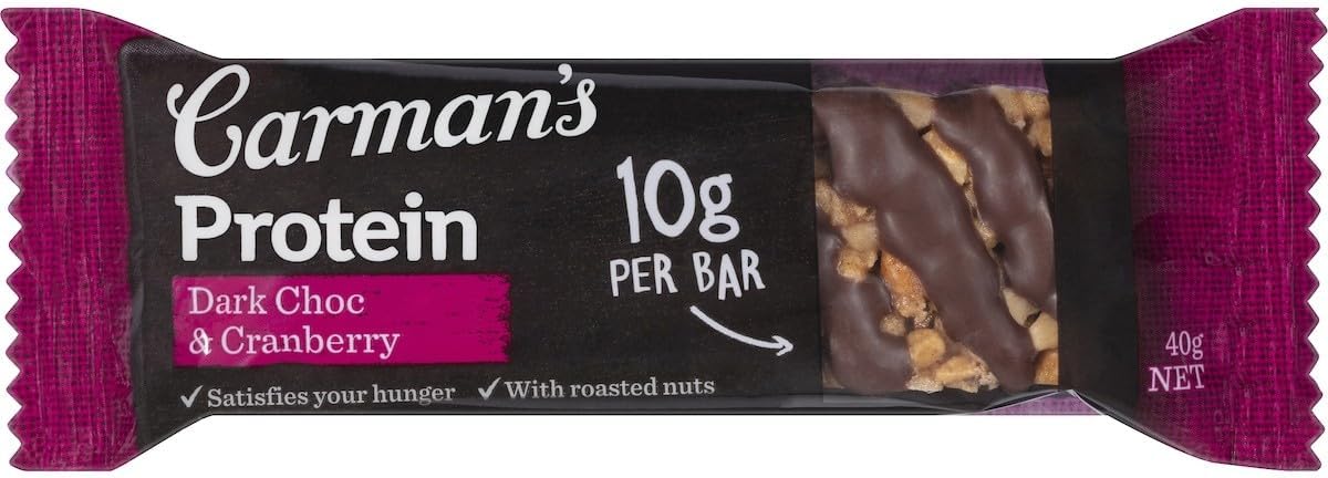 Carman’s Dark Choc & Cranberry Protein Bar features juicy ripe cranberries, crunchy seeds and golden honey on a base of tasty roasted peanuts and almonds, all drizzled in luscious dark choc – to bring you a full-flavoured, satisfying snack that keeps you feeling fuller for longer, with 10g protein per serve.