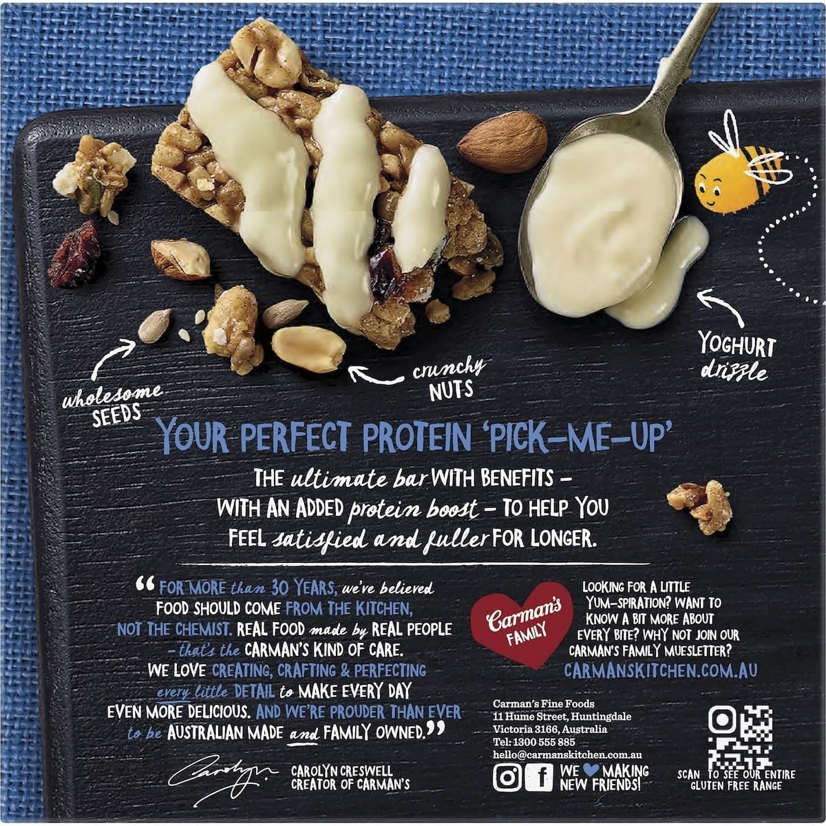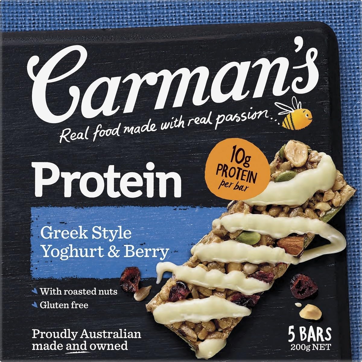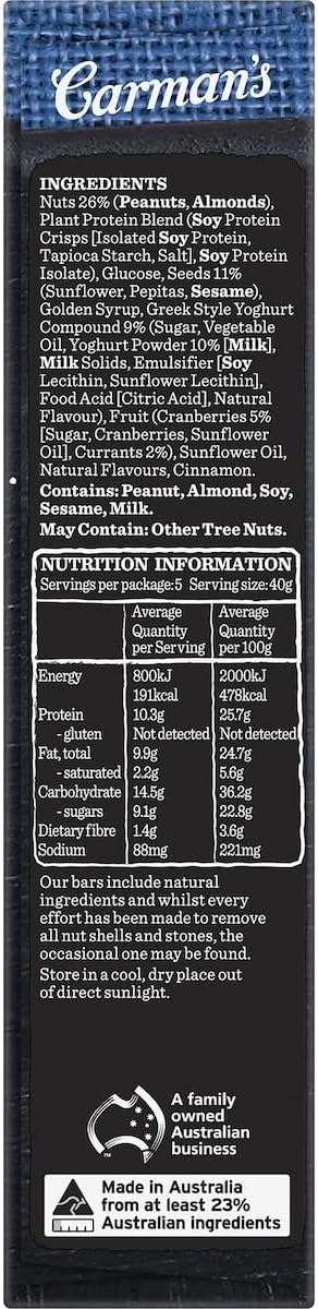 Carman’s Greek Style Yoghurt & Berry Gourmet Protein Bars are the perfect protein pick-me-up with 10g of protein per bar. Gluten free and made with a delicious blend of juicy ripe cranberries and currants, seeds and crunchy roasted nuts all topped with a tangy Greek yoghurt drizzle.